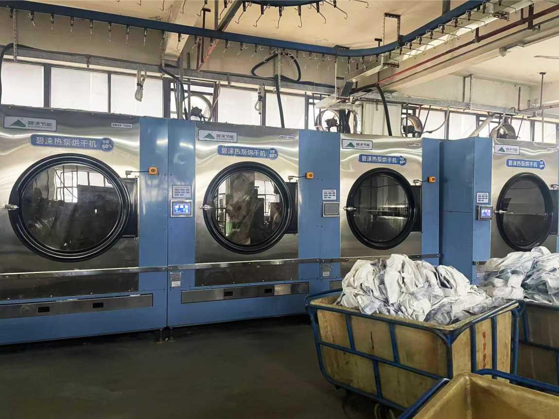 现改用碧涞热泵工业干衣机烘干一锅100条牛仔裤,重量约110公斤,平均用电约21度,电费单价为1元/度,