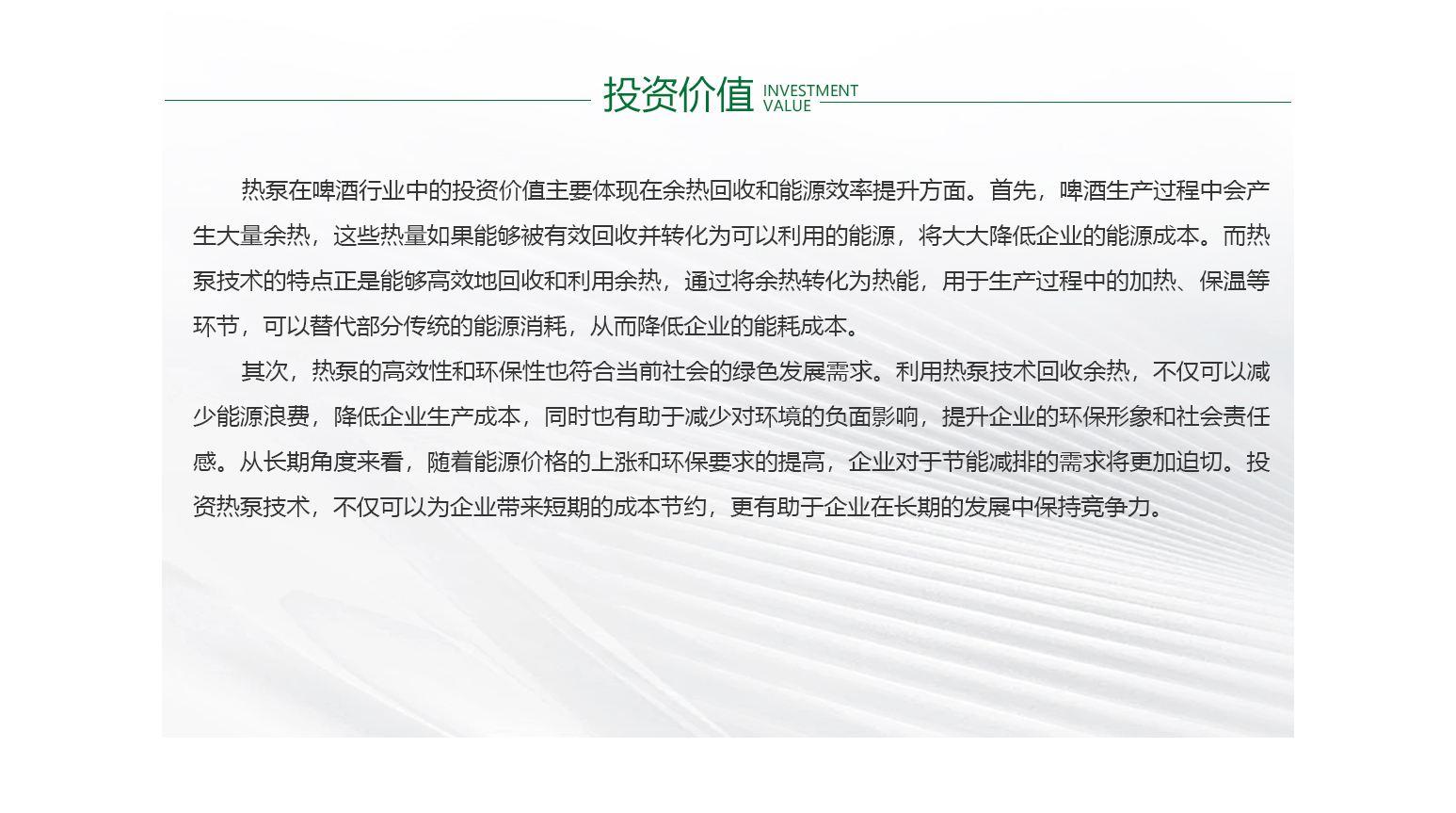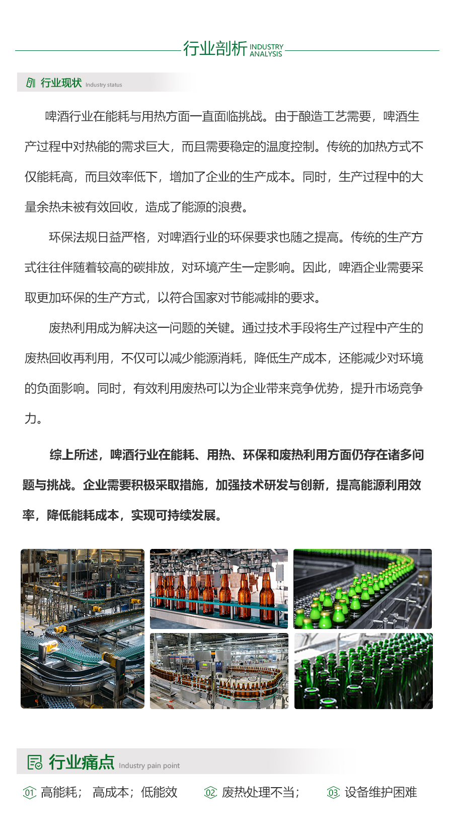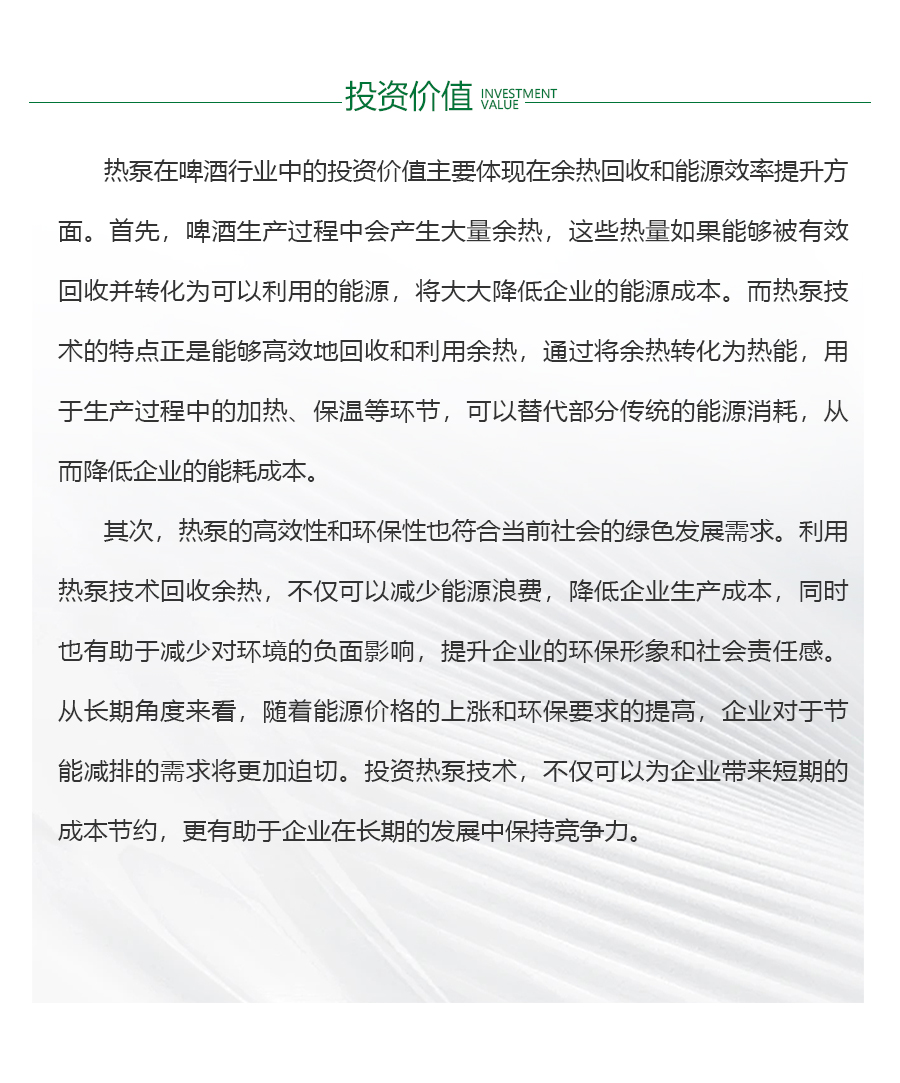 - 啤酒行业目前的用热状况普遍存在高能耗问题,生产过程中大量热能被消耗,同时废热往往未能得到有效利用,导致能源浪费严重。这种现状不仅增加了企业的能源成本,还对环境造成了负担。废热处理不当是行业面临的一大挑战,许多企业缺乏高效的废热回收和利用技术,使得原本可以转化为有用能源的废热被白白排放。因此,提高能效、降低能耗、加强废热利用成为啤酒行业亟待解决的问题。只有通过技术创新和设备升级,才能实现能源的高效转化和利用,推动行业的绿色可持续发展。