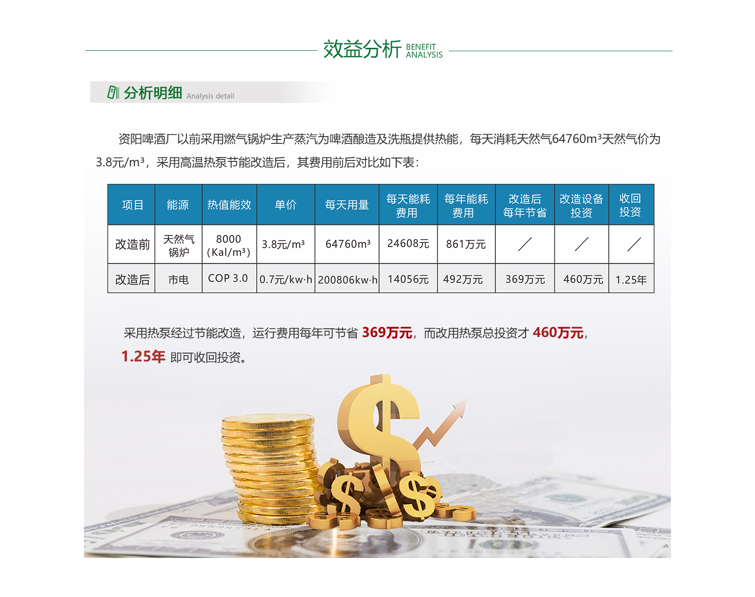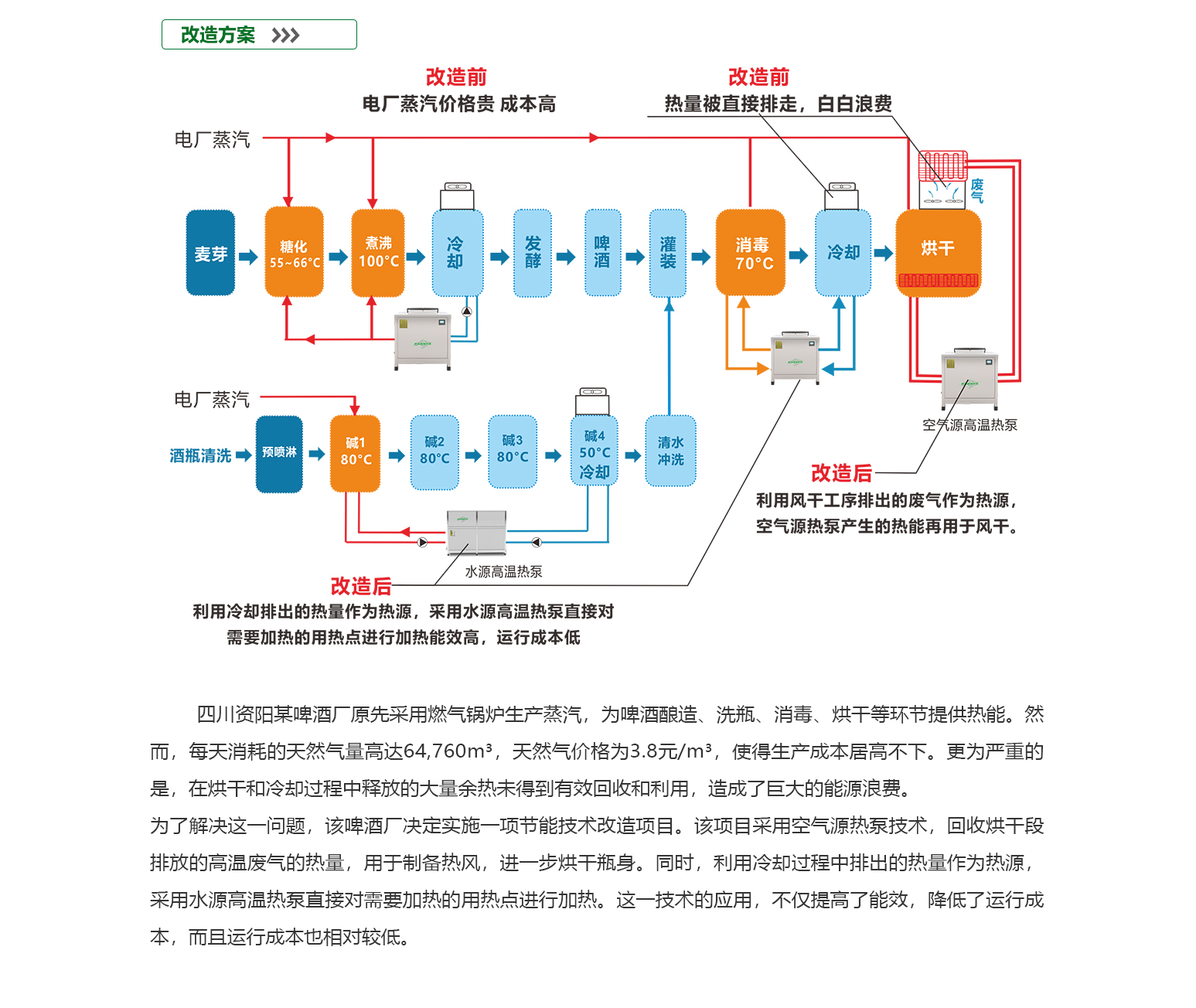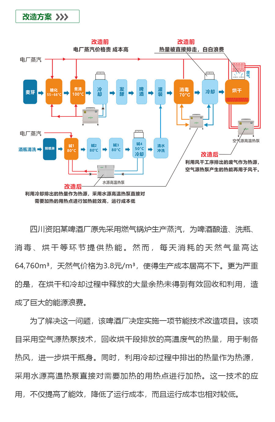 - 啤酒行业目前的用热状况普遍存在高能耗问题,生产过程中大量热能被消耗,同时废热往往未能得到有效利用,导致能源浪费严重。这种现状不仅增加了企业的能源成本,还对环境造成了负担。废热处理不当是行业面临的一大挑战,许多企业缺乏高效的废热回收和利用技术,使得原本可以转化为有用能源的废热被白白排放。因此,提高能效、降低能耗、加强废热利用成为啤酒行业亟待解决的问题。只有通过技术创新和设备升级,才能实现能源的高效转化和利用,推动行业的绿色可持续发展。